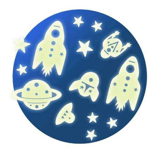 Decor fluorescent Cosmos O scenă spațială mare care trebuie creată cu o multitudine de elemente care strălucesc în întuneric (rachete, planete, stele etc.) lipite de pereți și tavan. Se încarcă la lumina zilei și strălucesc în întuneric, astfel încât micii astronauți să poată adormi liniștiți. Include: 62 de piese din plastic care strălucesc în întuneric, bandă dublu adezivă. Articol decorativ. Nu este jucărie.