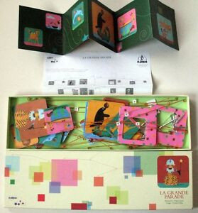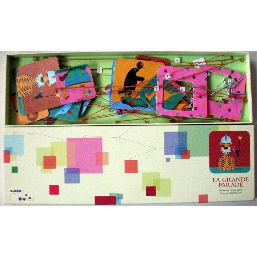 Decorație mobilă Marea parada Decorație mobilă, ușoară pentru a fi mișcată de adierile fine, cu forme care dansează în spațiu și clopoței delicați. Un subtil dans în echilibru și mișcare. Conține piese de sprijin (sârma întărită) și formele decorative (piese cartonate ilustrate cu animale și clopoței metalici). În interiorul cutiei se află schema de asamblare (în imagini). Ilustrații de Regis Lejonc. Design: Christel Sadde.