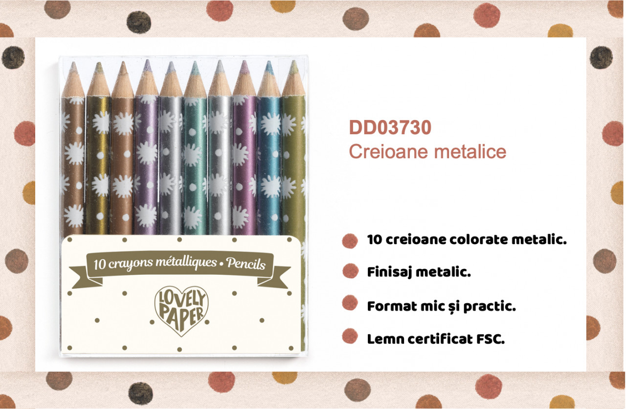Conține: 10 mini creioane colorate metalice. AVERTISMENT: Contraindicat copiilor sub 3 ani. A se utiliza sub directa supraveghere a unei persoane adulte. ATENȚIE: Nu este o jucărie. Articol papetărie. Producător: Djeco, Franța.