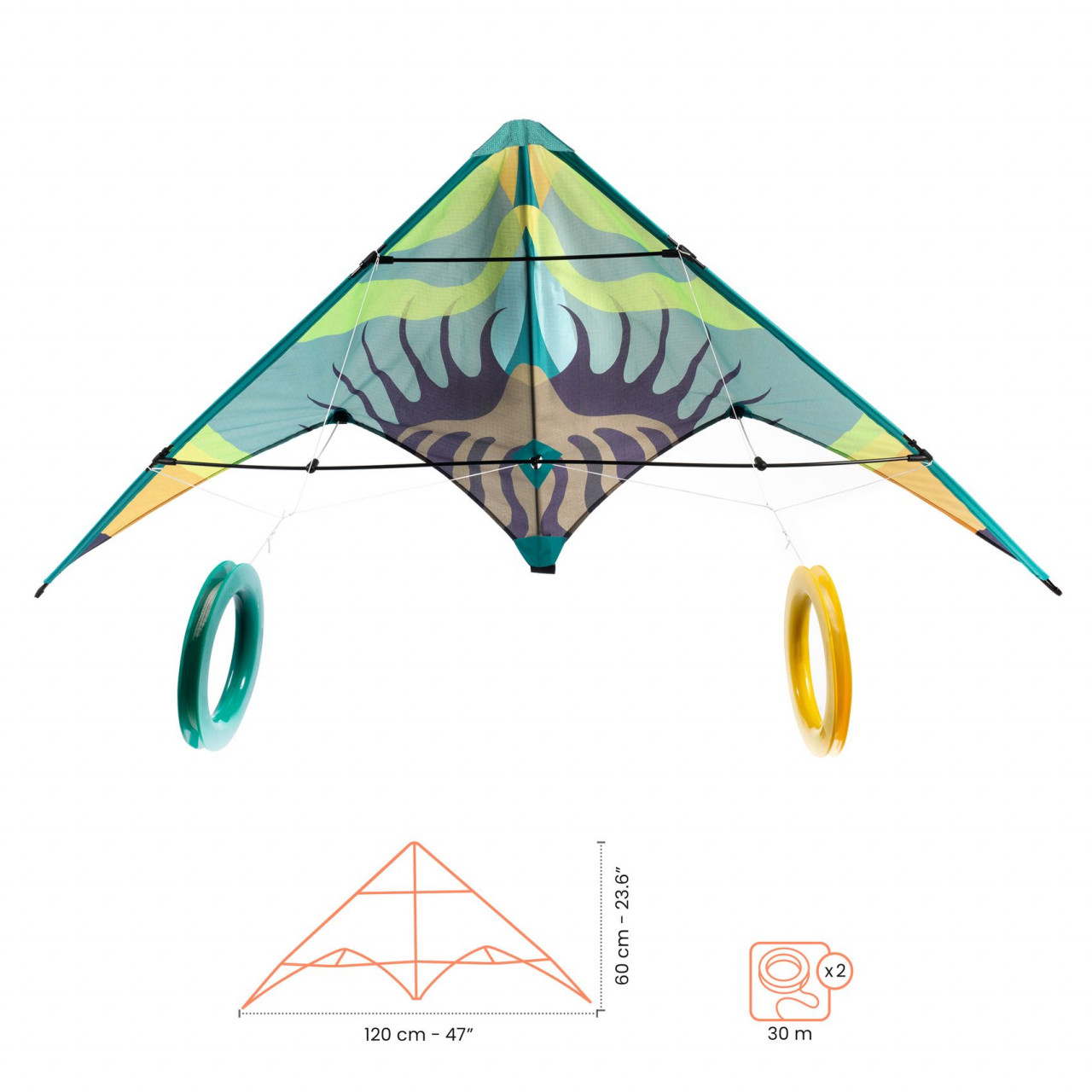 Zmeu acrobatic Valuri Zmeu de acrobație cu dublă mânuire. Zmeu acrobatic pop-up: ușor de asamblat și demontat, cu husă pentru depozitare. Este inclus un ghid de utilizare ilustrat cu diagrame pentru a învăța acrobațiile și a descoperi zborul. Materiale rezistente și durabile. Conținut: zmeu pânză (H. 60 x L. 120 cm), 2 sfori de 30 m, 2 mânere, cadru din fibră de sticlă și husă pentru depozitare. Recomandat pentru vârste începând cu 8 ani, cu supravegherea unui adult.