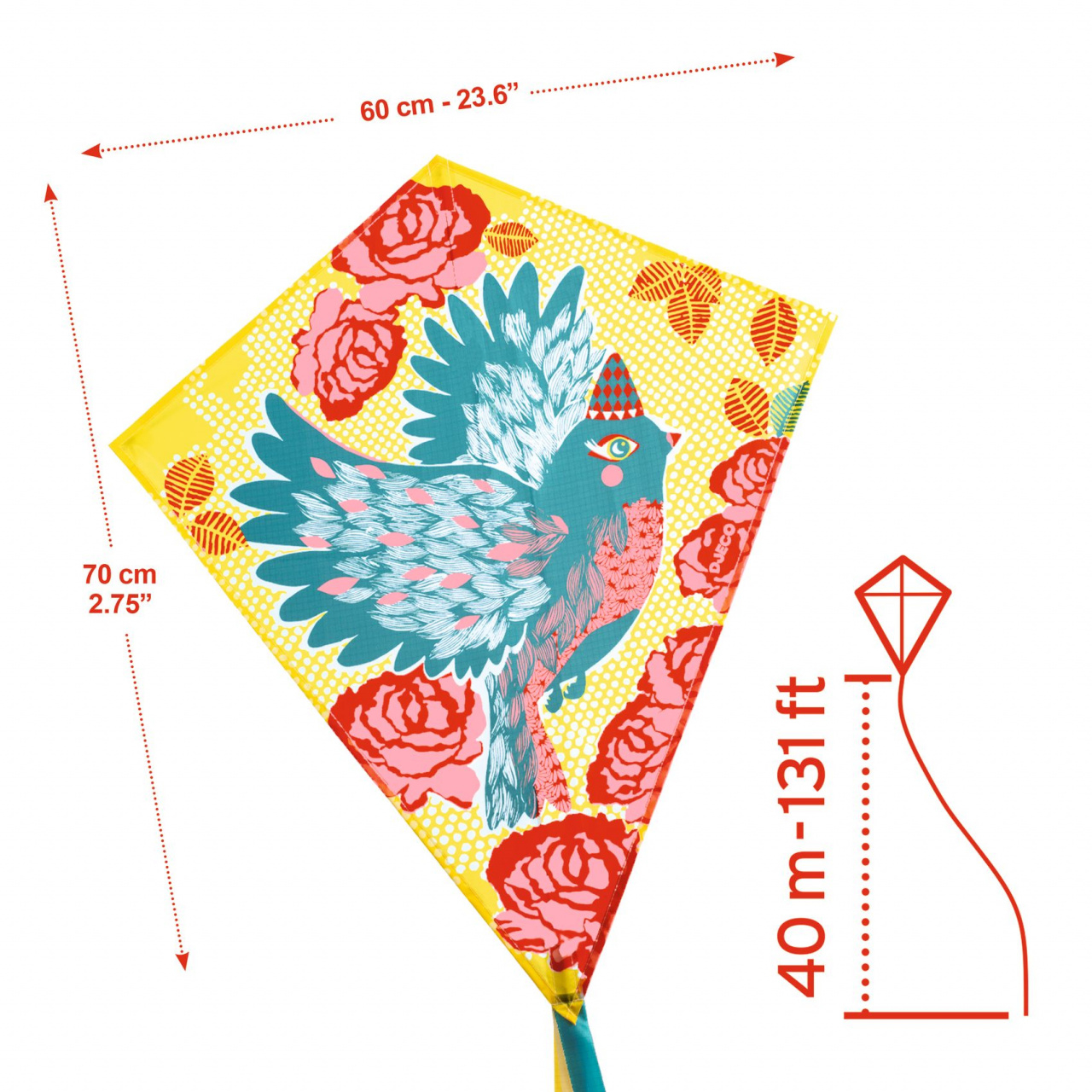 Dimensiuni: 60 x 70 cm (+ 2,5 m coada) Vârsta recomandată: + 5 ani. Confecționat din materiale non-toxice, conform reglementărilor EN71 & ASTM. Certificare FSC®. AVERTISMENT: Contraindicat copiilor sub 3 ani. A se utiliza strict sub supravegherea unei persoane adulte. Conține fir lung. Producător: Djeco, Franța