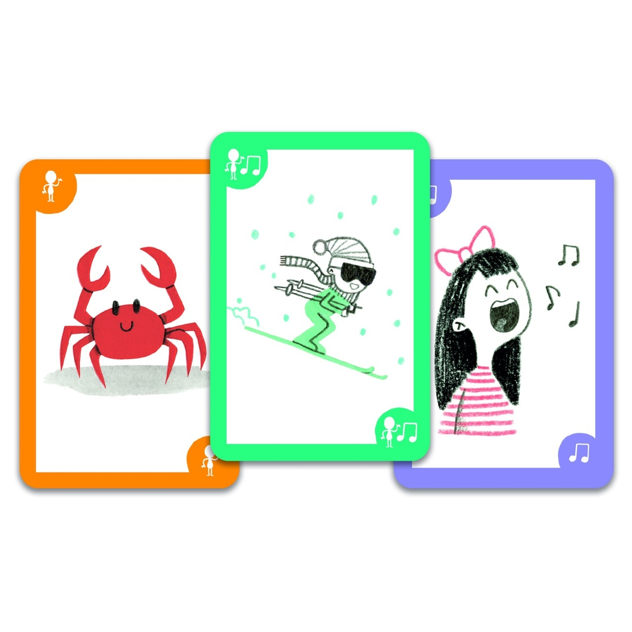 Joc de mimă și sunete pentru copii – 120 de idei amuzante Un joc captivant și ușor de înțeles, pentru copiii mici care încă nu știu să citească! Jucătorii trebuie să ghicească ce este ilustrat pe cartonaș, imitând sunetul sau mimând. Distracția este garantată! Cu 120 de idei ilustrate simpatic, acest joc stimulează imaginația, spontaneitatea și capacitatea de exprimare non-verbală. Pentru 2 până la 4 jucători, acasă sau în deplasare. Design confortabil pentru copiii mici. Cărți de formă mare, ușor de ținut și manevrat. Reguli simple, ușor de înțeles. Cutie compactă, ușor de transportat. Jocul conţine 120 de cartonașe ilustrate + reguli de joc