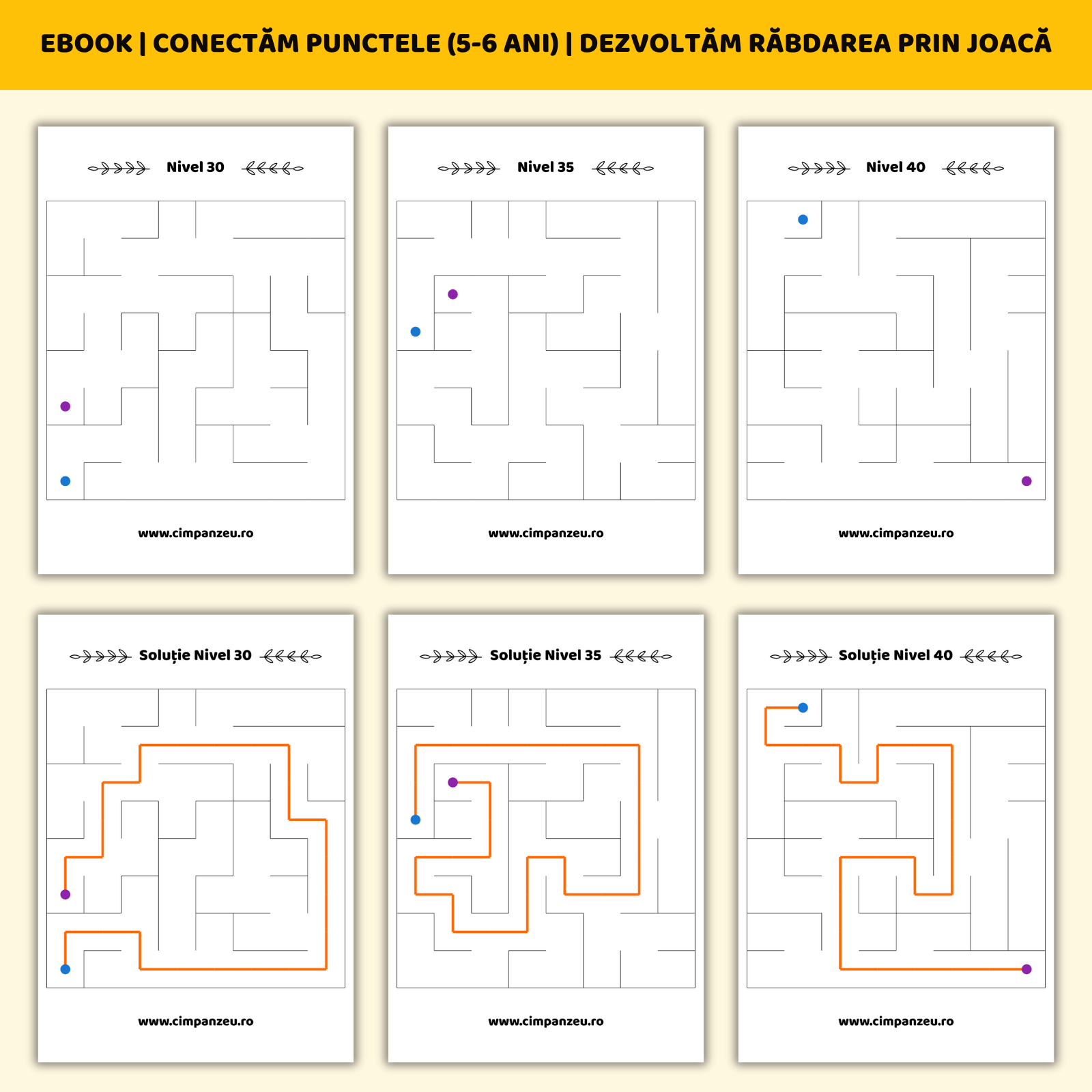 Acest set de 40 de fișe printabile este creat special pentru copiii de 5-6 ani. Misiunea este una nouă și captivantă: nu doar să găsească o ieșire, ci să descopere calea corectă pentru a conecta cele două puncte colorate