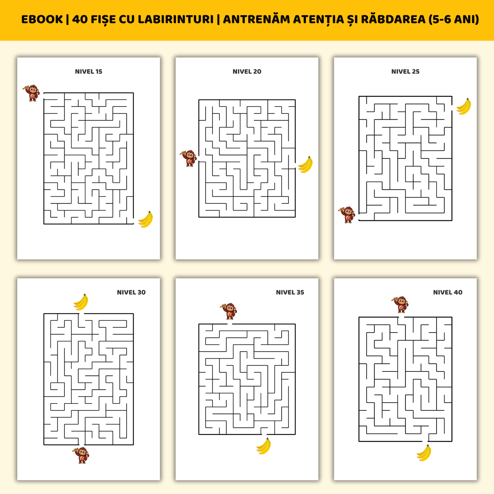 E timpul să trecem la nivelul următor! eBook-ul 40 Fișe cu Labirinturi | Antrenăm Atenția și Răbdarea (5-6 ani) este o colecție captivantă de 40 de labirinturi cu un grad de dificultate mai ridicat, gata de printat.
