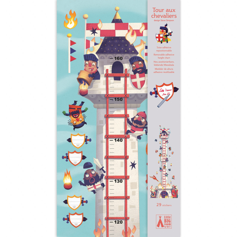 Abtibilduri masuratoare Turnul cavalerului Decorație pentru camera copilului - abțibilduri repoziționabile măsurătoare, ideală pentru a măsura micii cavaleri în timp (până la 1,60 m). Un turn înalt de asamblat și autocolante de plasat în jurul lui pentru a crea ceva unic. Sunt incluse etichete adezive destinate scrierii numelui copilului, înălțimii și vârstei, precum și a datei. Conține 27 de autocolante.