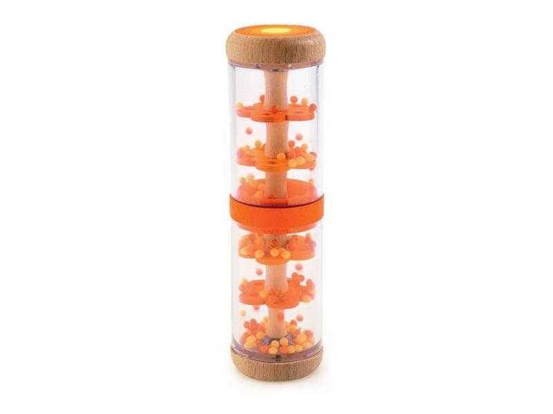Jucarie bebe Ploaie colorata portocaliu Jucărie pentru stimularea senzorială (auditiv şi tactil) şi dezvoltarea îndemânării. Este o jucărie amuzantă și captivantă pentru cei mici. Bebelușii întorc și scutură jucăria pentru a vedea cum cad mărgelele și ascultă sunetul moale al ploii. Poate fi folosită şi ca instrument muzical de ritm.