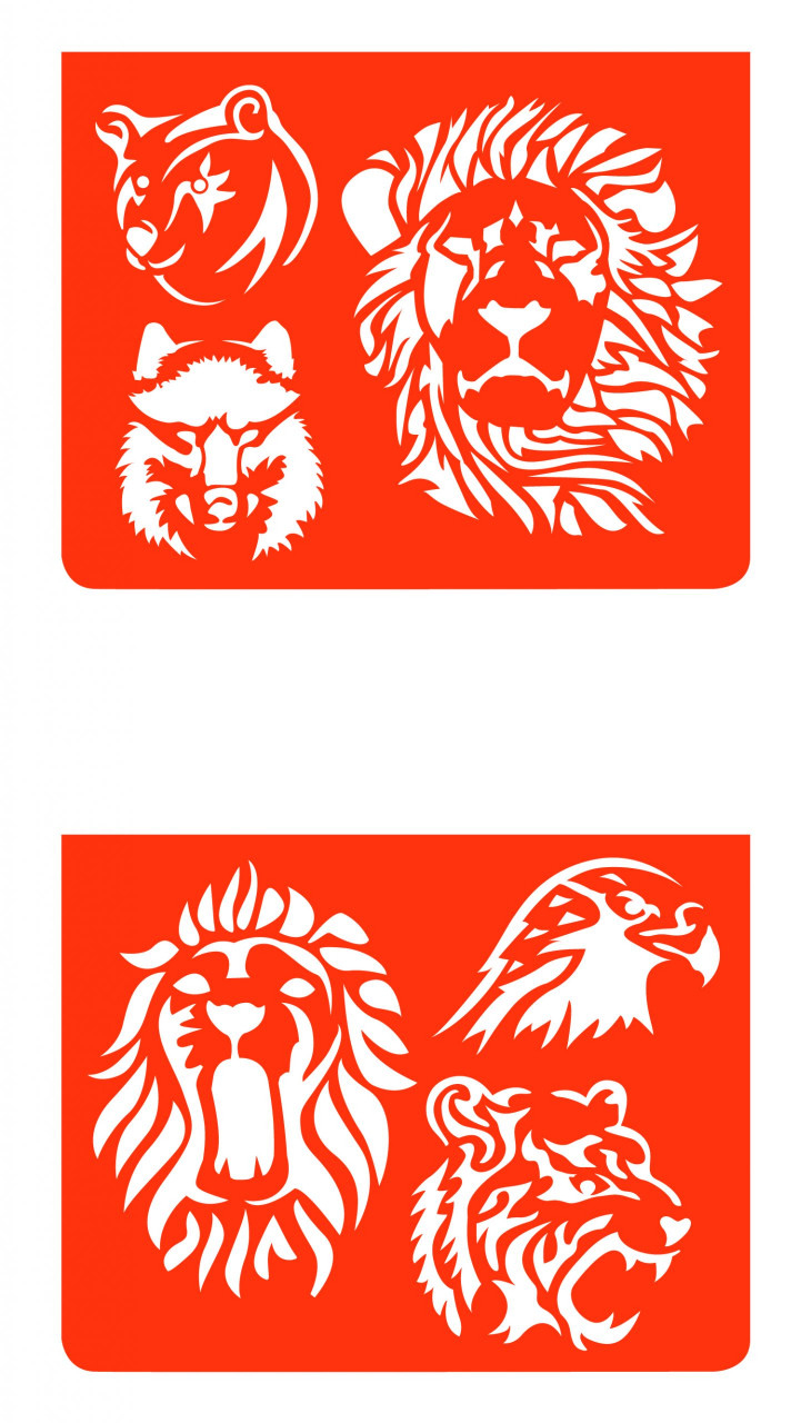Set sabloane Animale salbatice Doua șabloane din plastic flexibil. Imaginile pot fi acoperite cu vopsea tip spray sau prin tamponare.