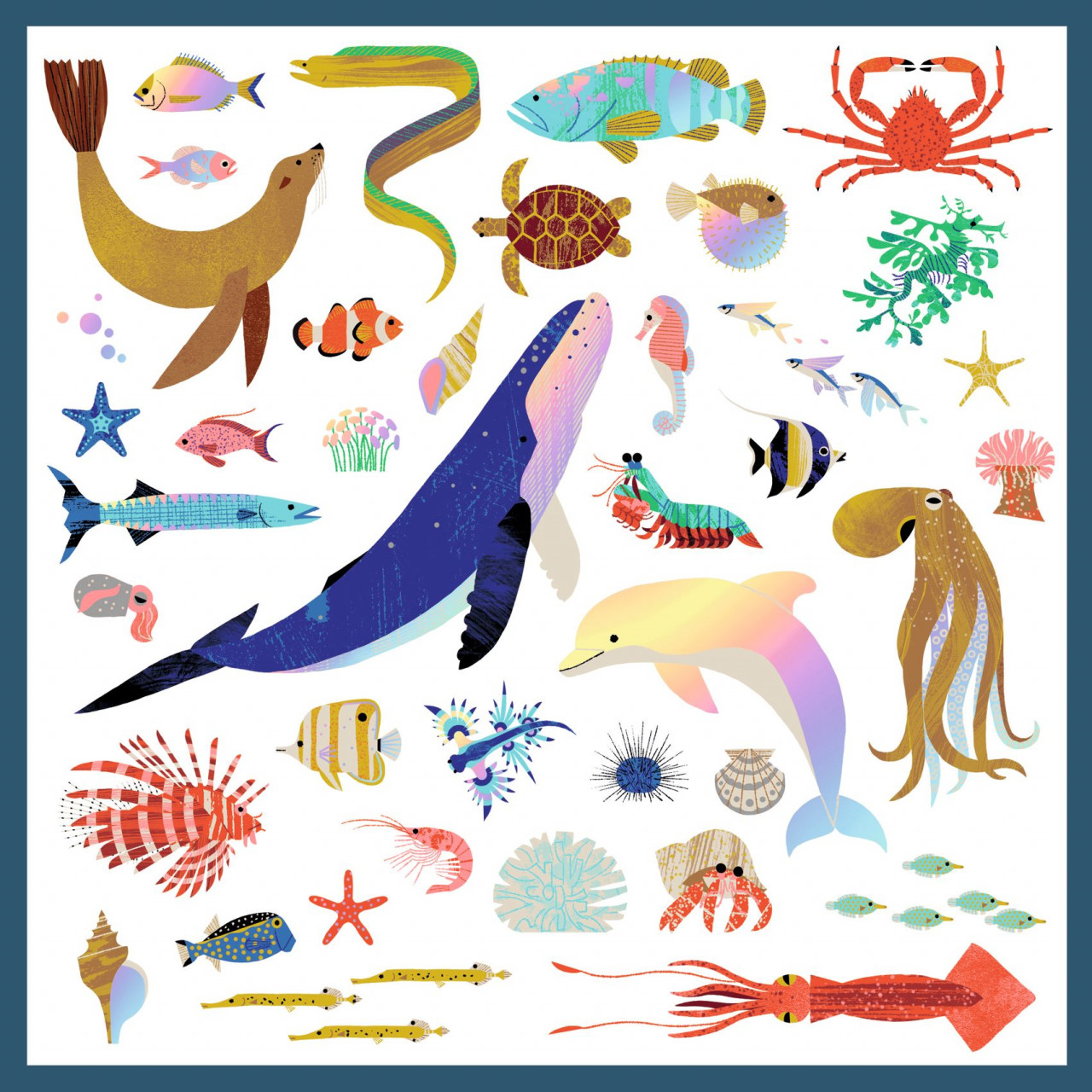 Abtibilduri metalice Ocean O mapă cu 160 de abțibilduri cu tematica marina.. Peștele spadă, crabul pustnic, peștele-soarelui oceanic, căluțul de mare... atât de multe animale marine diferite și strălucitoare de descoperit! Lipește numeroasele autocolante cum vrei și creează-ți propriile scene sau decorează orice vrei! Conține 160 de stickere, 2 foi diferite (20 x 20 cm) fiecare în dublu exemplar, pentru a reutiliza autocolantele preferate.