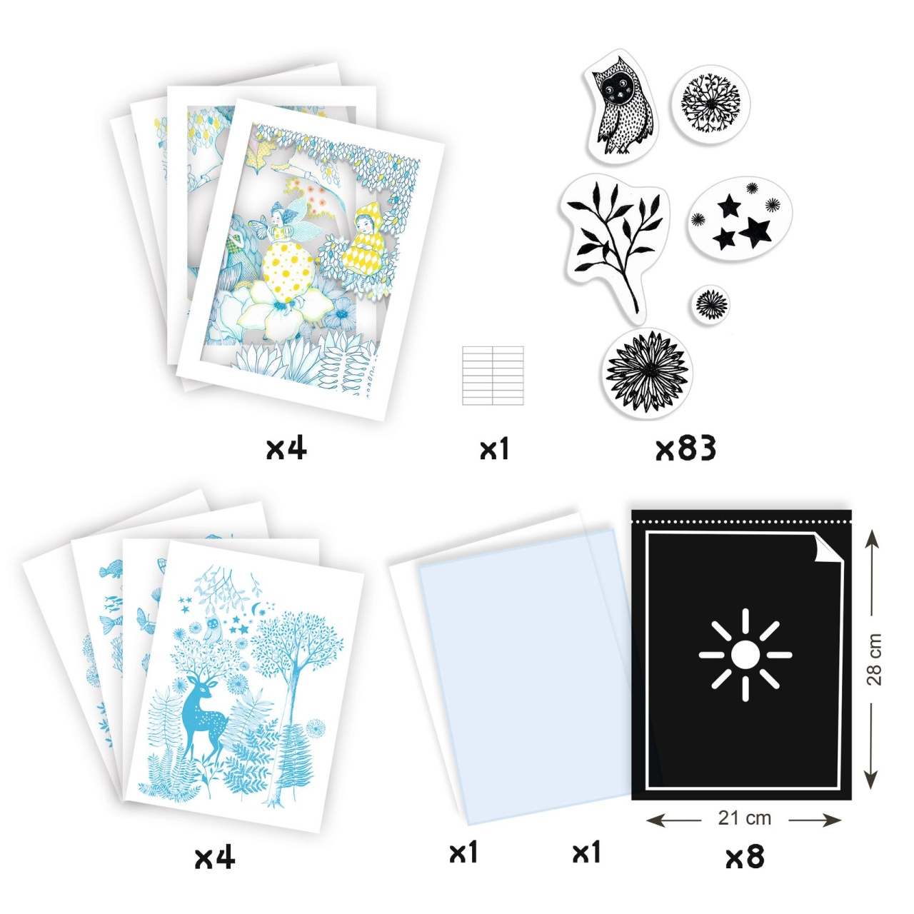 Atelier magic inspirat dintr-un procedeu împrumutat din fotografie: cianotipia. Folosind modele opace și elemente naturale la alegere, copilul creează scene pe hârtie fotosensibilă. După expunerea la soare, hârtia este marcată cu modele negative. După ce clătește hârtia într-o baie de apă limpede, se dezvăluie scena pe un fundal albastru! Modele inspirate din natură pentru a crea 4 opere de artă nocturne și poetice. O abordare cu totul nouă a ilustrației prin imprimarea de modele pe peliculă de acetat! Fiecare creație este unică. O activitate care poate fi repetată, datorită rezervelor de hârtie pentru cianotip (vândute separat, cod DJ09338). Rame elegante tăiate cu laser pentru a transforma fiecare creație într-o adevărată capodoperă! Conținut: 4 rame tăiate cu laser, 8 foi de hârtie fotosensibilă (21 x 28 cm), 85 de modele imprimate pe acetat, foaie de plexiglas, foaie de autocolante față-verso, broșură color cu instrucțiuni pas cu pas.