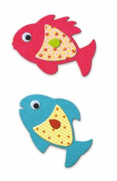 Colaje din pâsla cu pești O activitate de colaj cu tematică pești, special concepută pentru copiii mici. Copiii aleg forme de pește din pâslă și le decorează așa cum doresc, cu autocolante și ochi în relief. Odată ce s-au distrat creându-și peștii, îi pot lipi așa cum doresc. Piese mari ușor de mânuit, cu texturi diferite și accesorii nostime. Conținut: o gamă de autocolante: 24 de forme de pești din pâslă, 6 foi cu „înnotatoare” și 2 foi cu „ochi”.