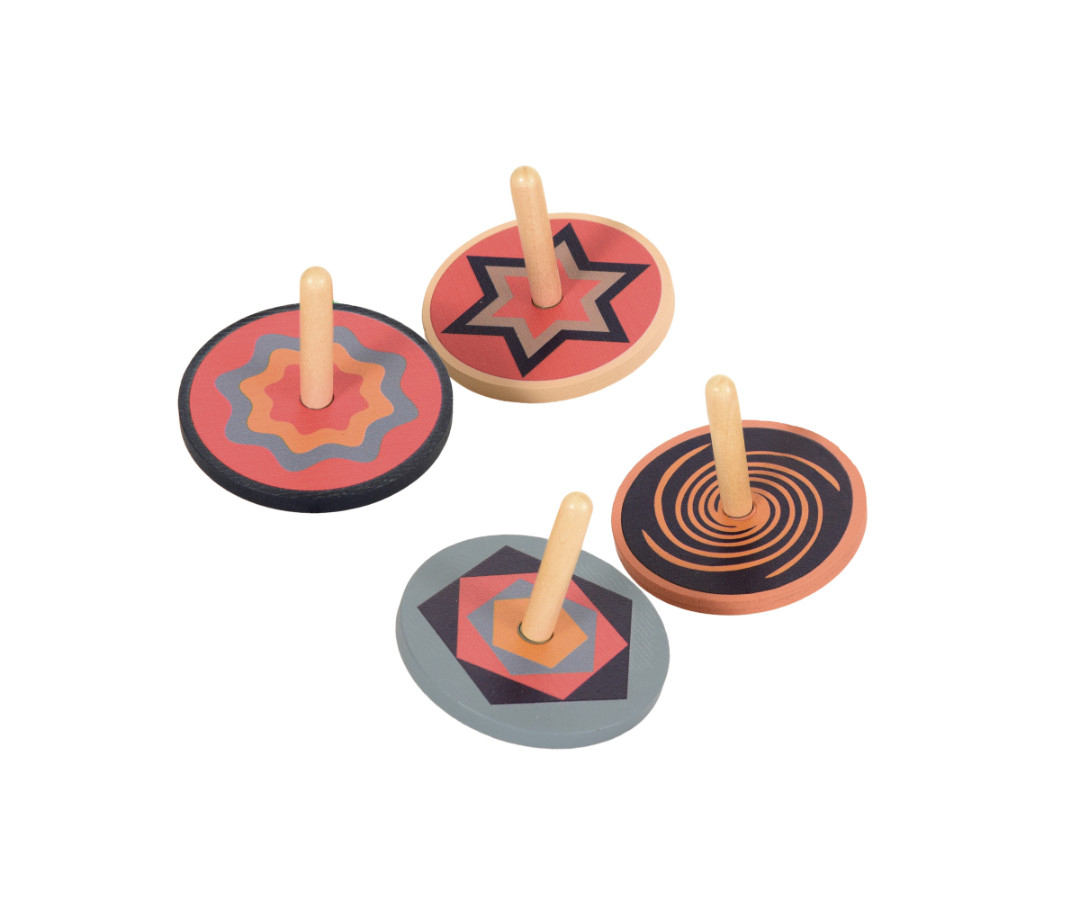 Titirez din lemn cu desene grafice Învârte-l cât poți de tare ca lumea din jurul lui să zboare și liniile desenate să se combine și apoi să se piardă. Fiecare model de titirez are modul său unic de a se învârti, creând efecte optice, interesant de observat. Dezvoltă îndemânarea, motricitatea fină, coordonarea, simțul tactil. Copiii vor observa acțiunea cauză-efect.